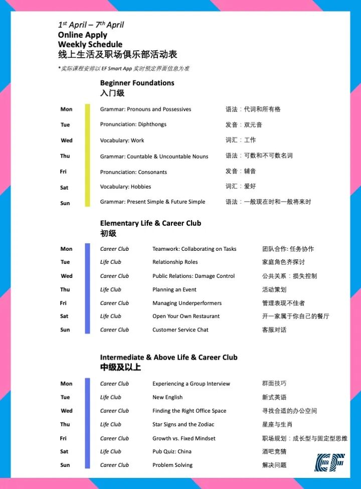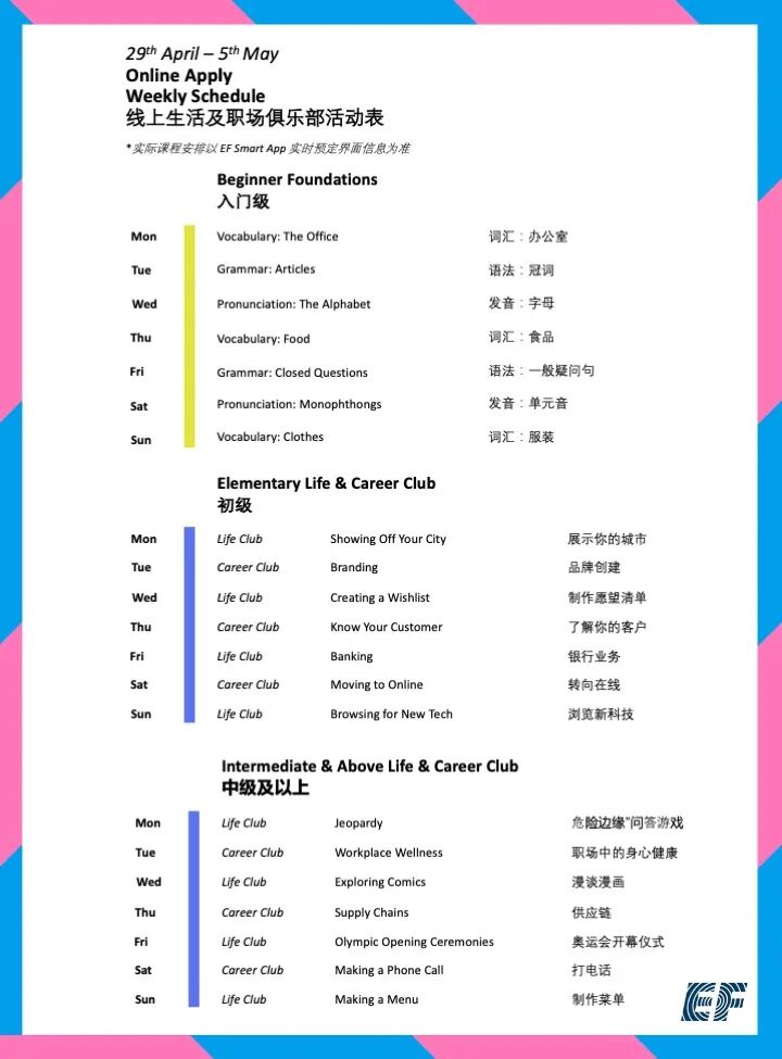 只需在本公众号EF教育集团官方后台回复关键词“课表”即可查询当月线上课程课表