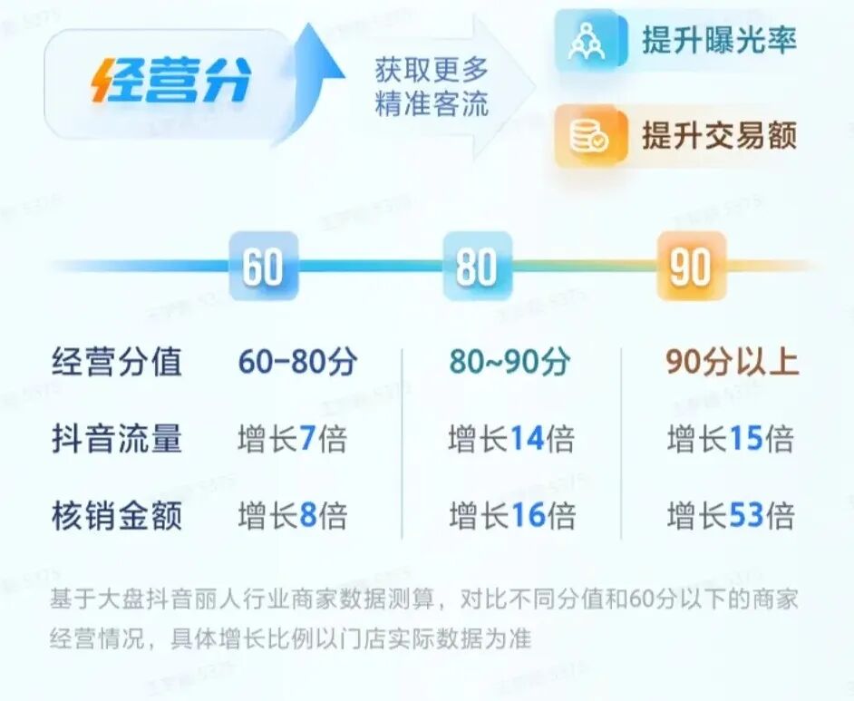 「经营分」是由抖音生活服务官方出品,基于装修、商品、内容、体验、评价五个维度综合计算的经营分值,满分 100 分。「经营分」作为线上经营能力的衡量标准,旨在提升商家经营能力,夯实长效生意增长基础。经营分越高,商家流量越多,门店生意越好。经过实验论证,商家经营分提升对门店流量、核销GMV、复购、投放广告均有正向作用,建议商家可以持续提升经营分,保证营销与经营双效提升。