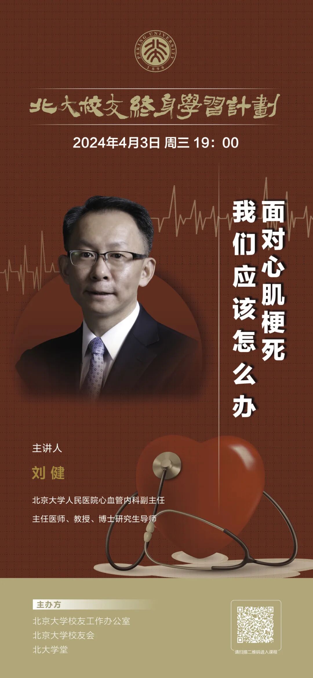 刘健教授从1999年至今一直工作在心肌梗死救治的第一线,并参与创建了中国第一家“胸痛中心”,目前担任“国家胸痛中心委员会副主席”。创建“刘健医生说心脏”健康科普公众号,每天稳定推送科普内容,在新华社客户端、“人民好医生”客户端等媒体开设专栏,创作并出版了6部科普著作,科普内容惠及1.5亿人。获得“全国创新争先奖状”、北京医学科技奖“医学科普奖”、“白求恩精神践行者”等荣誉。