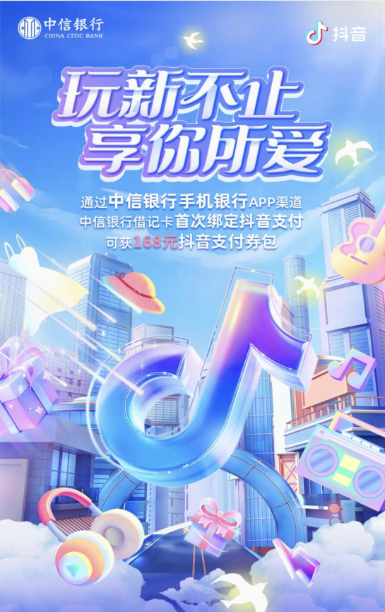 活动期间,通过中信银行手机银行APP、银行网点柜台机等银行端的一键绑卡功能,且是在武汉合众易宝渠道(抖音支付)首次绑定中信银行借记卡的用户,即有机会获得168元绑卡支付券包。活动期间月总名额62000个,每日限制参与名额2000个,先到先得,每位首绑客户限参与1次。最终所获支付券以抖音支付发放为准。