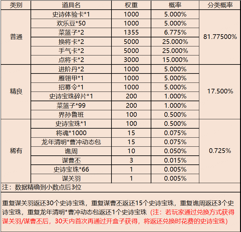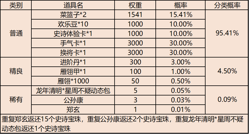 打开必得将魂*2、雁翎*20、心愿积分*1,额外几率开出以下道具: