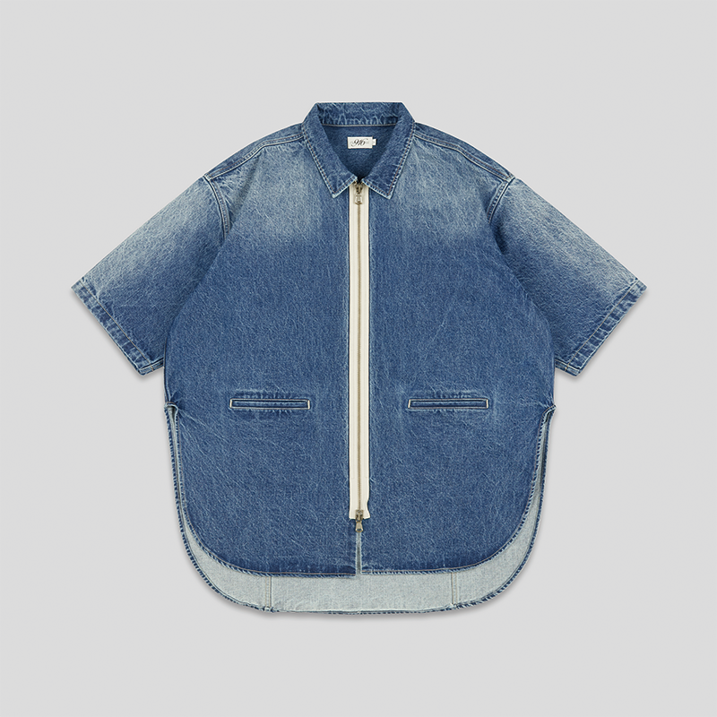 GOODBAI 916 撞色拼接牛仔拉链短袖衬衫
