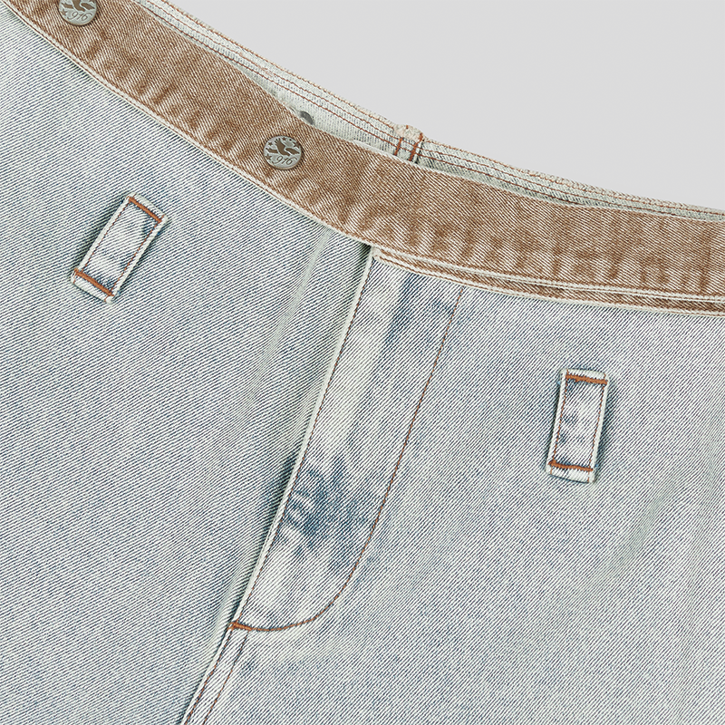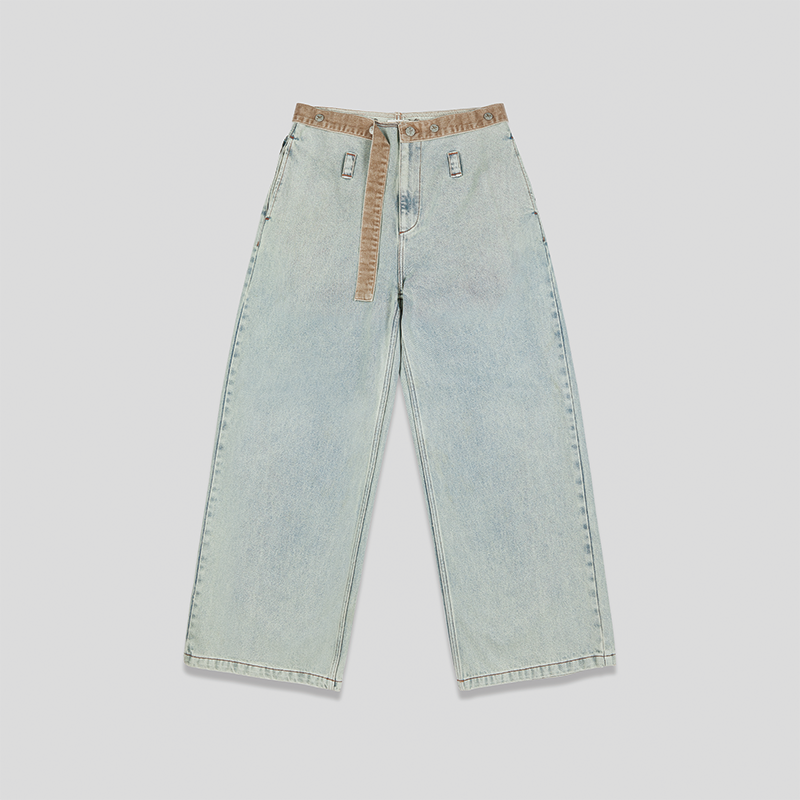 宽松版型,利落裁剪,打造休闲街头风格;水洗牛仔布呈现自然做旧感;可拆卸腰带代替传统腰头设计,下方以裤袢装饰,增加视觉亮点。