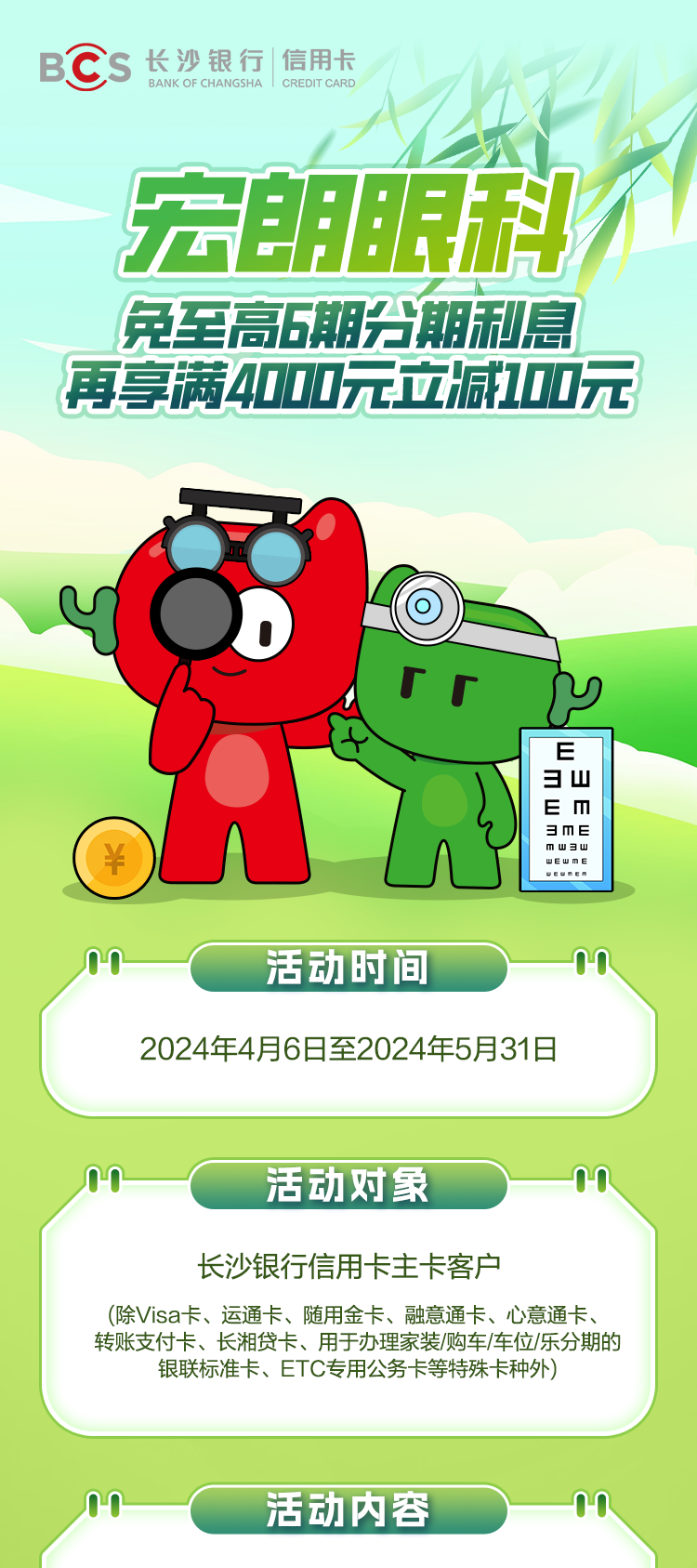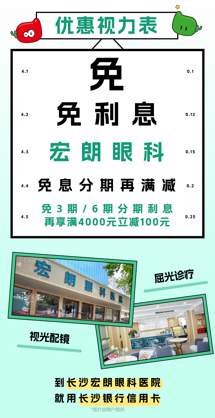 活动期间,客户在长沙宏朗眼科医院通过银联聚分期使用长沙银行信用卡分期支付,可同享以下2种优惠: