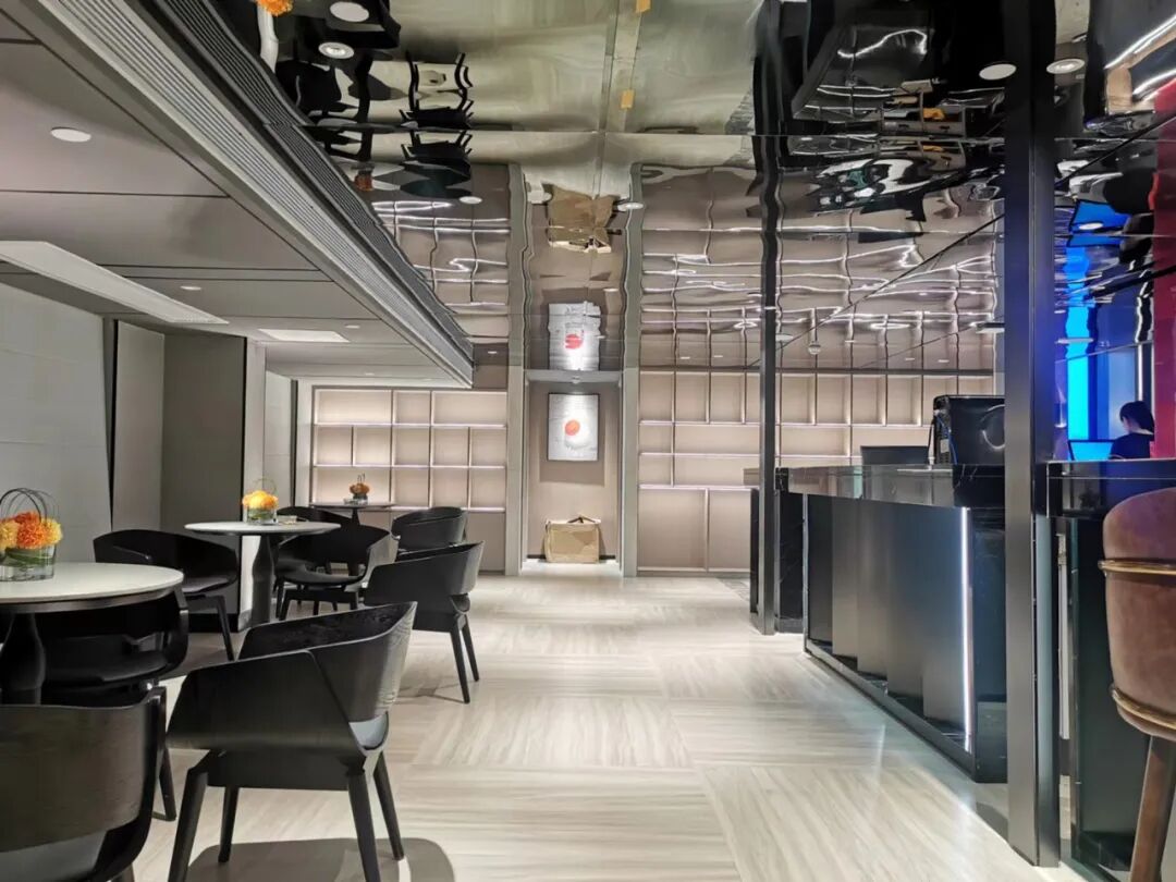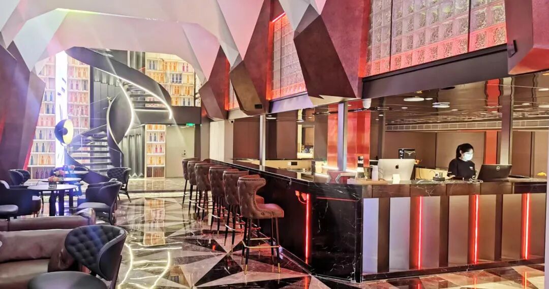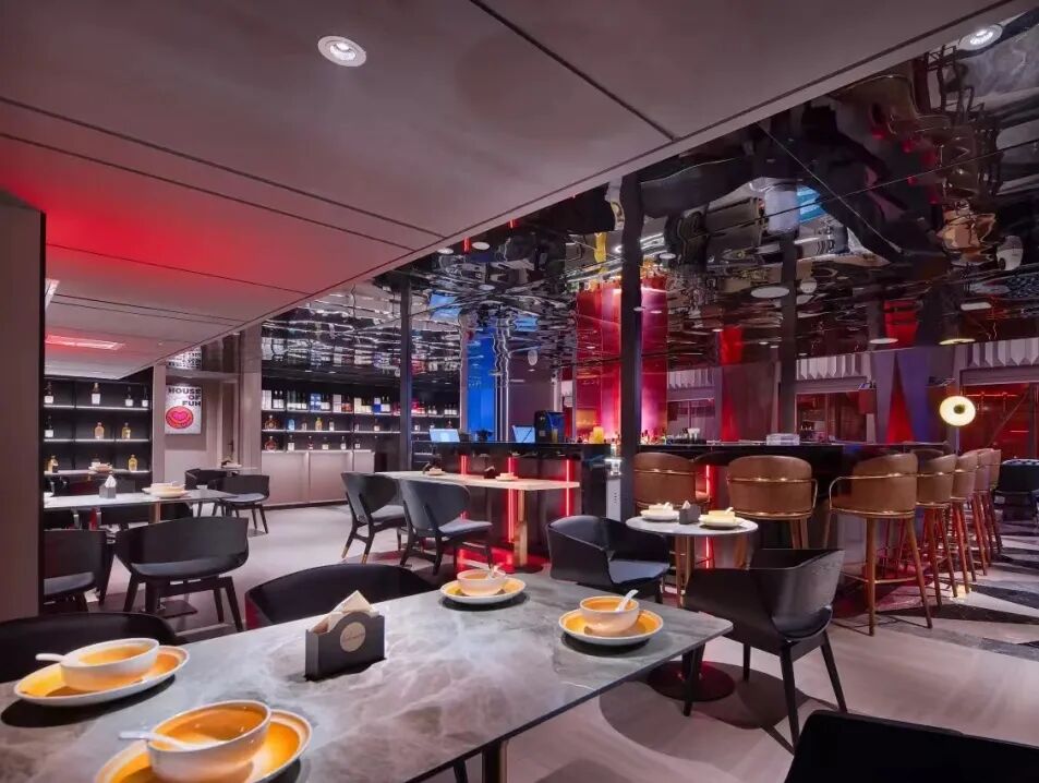 餐饮休闲空间主要采用防眩筒射灯,尽显温馨柔和却不失明亮。餐饮区以金属流线设计,选用石纹餐桌,搭配复古皮质沙发、通过红色与金属银色的打造异度空间迷城,为顾客带来极强的感官刺激,将科幻电影中的赛博朋克世界搬入现实。