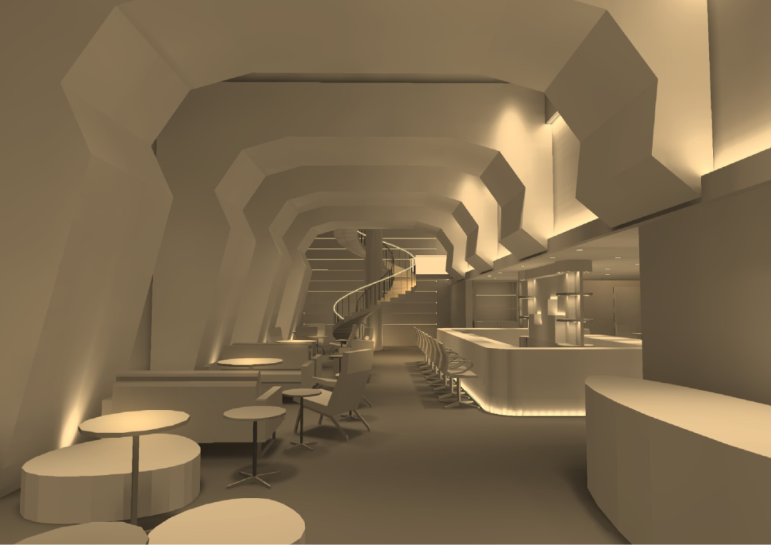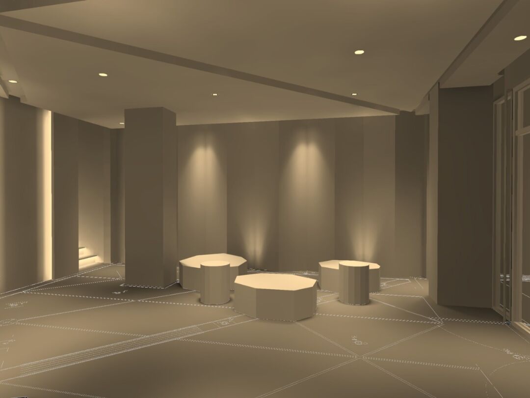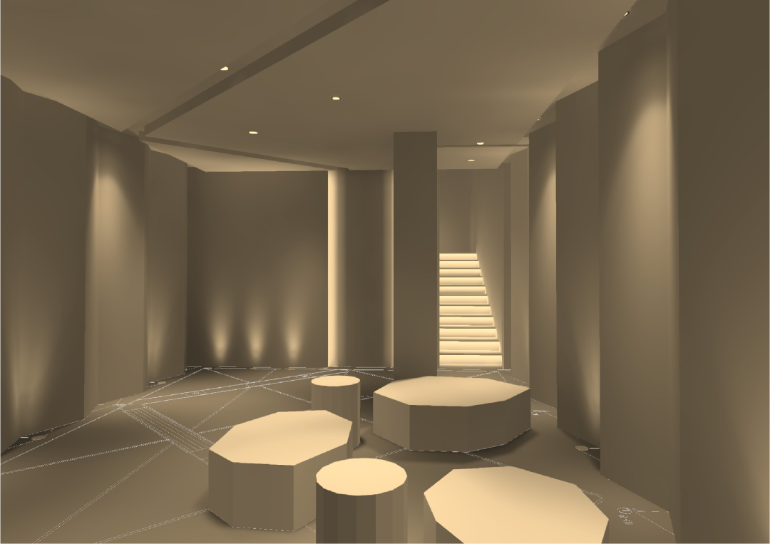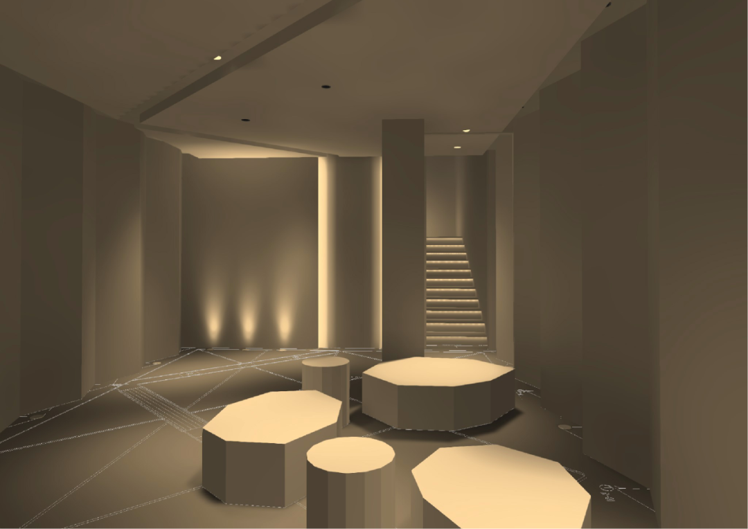 深夜模式:在深夜期间大门入口、电梯及LOGO标识墙灯具开启至亮度最大值,大厅空间灯光在满足照度的情况下选择性关闭一部分灯具,台阶灯带亮度调至20%,既保证酒店的标识照明也为后半夜到访的顾客营造舒适安静的灯光氛围。