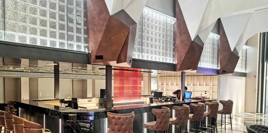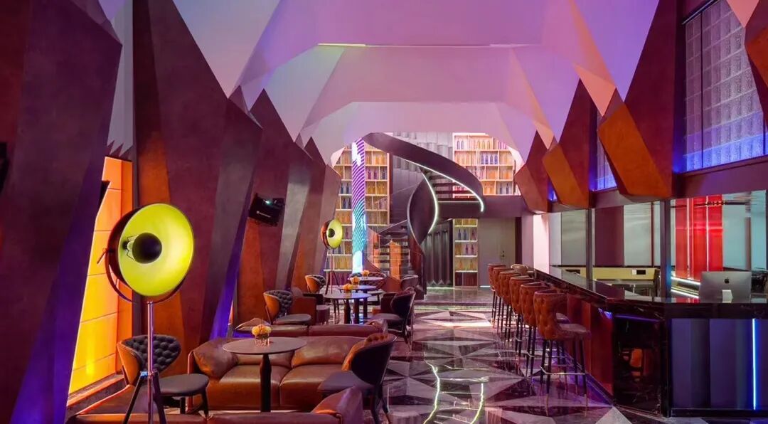 酒店大堂延续了高挺硬朗的现代赛博朋克风,办理入住的顾客置身此地,仿佛打开全新的异度空间。映入眼帘的大堂穹顶采用大面积暖色调营造陨石质感。搭配美的智能射灯,角度36°的光影投射。