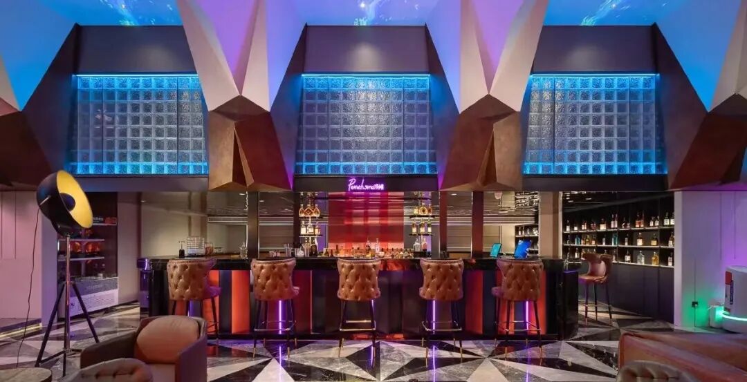 透过蓝、紫、青等冷色调及红色的霓虹光影交织、充分利用线面的呈现还原墙面利落感。在动态光影配合之下,空间被赋予生命,冰冷的空间也因此变得生动且富有情感。