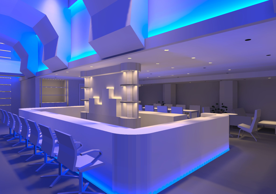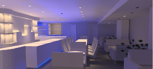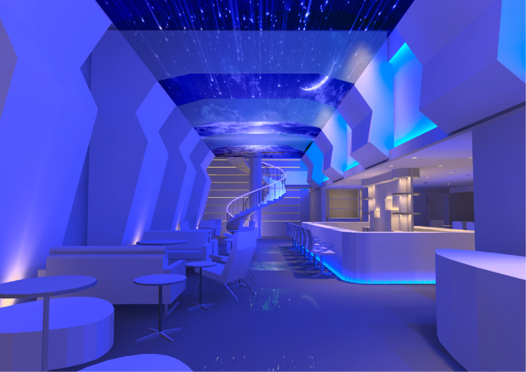 节日模式:大厅灯光全部开启,照明调至最大值照亮空间,大厅地面射灯灯光色温调整至蓝光,冷暖搭配,空间层次分明,整体色彩绚丽时尚,情调满满,为顾客营造新奇雅致的节日氛围。