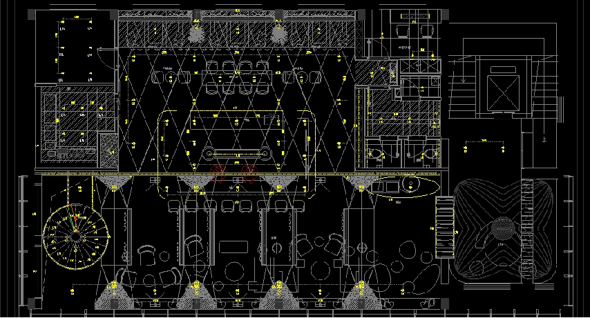 餐厅灯光全部开启,照明亮度调至最大值、餐台,灯光静态设置,灯光以暖白色光为主,通过高亮度的灯光配合还原食物色彩,为顾客提供愉悦的就餐灯光氛围。