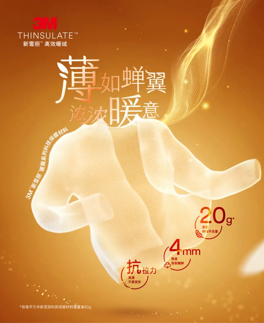 全新推出的3M™新雪丽™暖翼科技材料不同于传统轻薄型保暖材料,它在3M™新雪丽™无纺技术平台科技加持下,从材料到结构,再到工艺技术都实现了革新与突破,20g/m2的轻盈,4mm的厚度,真正做到轻盈“薄”暖,时尚舒适。除此之外,它还拥有良好的透气性与耐洗涤性,锁温保暖的同时,舒适透气,不易变形持久耐穿。