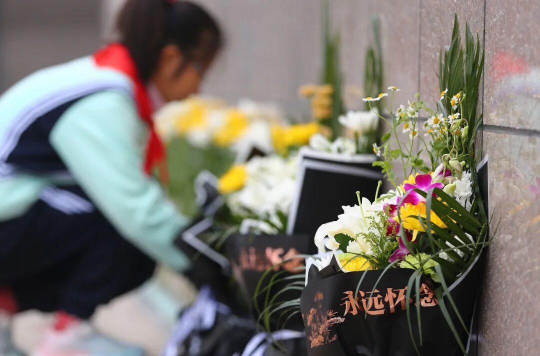 4月3日,山东枣庄,薛城区临山小学学生在铁道游击队纪念碑前敬献鲜花。