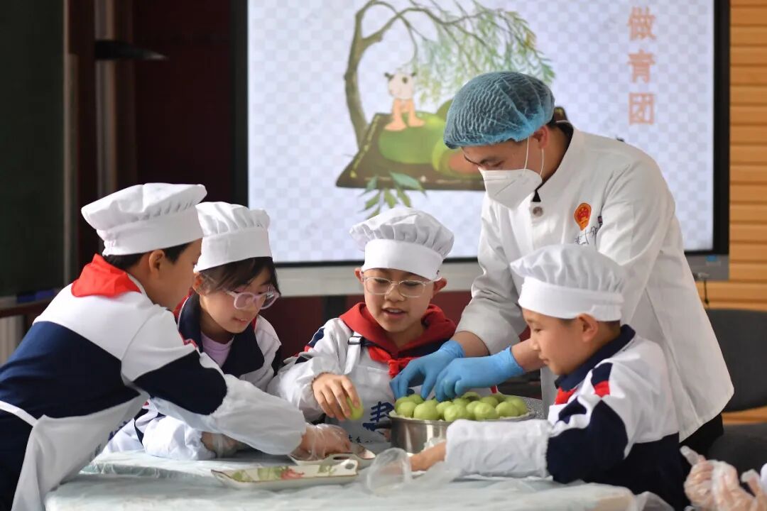 4月3日,青岛,市北区陵县路小学的学生们学习青团制作。