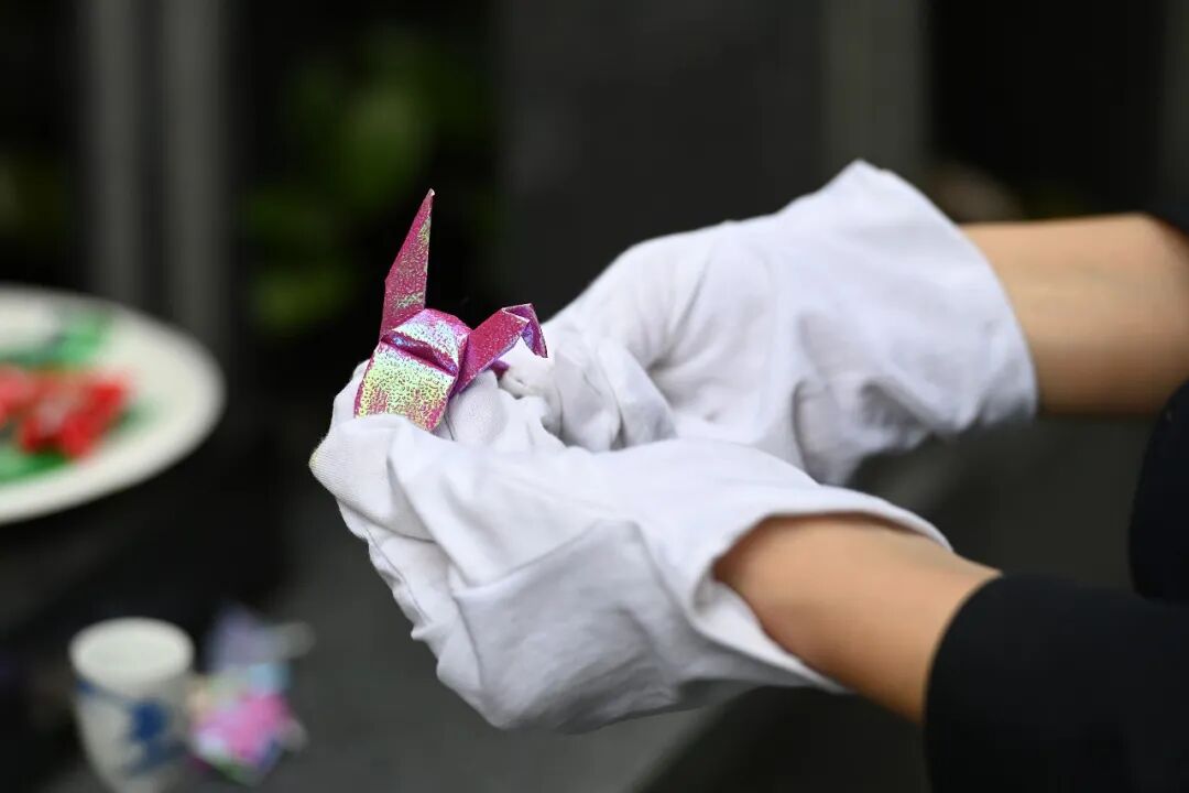 4月2日,重庆,松鹤园陵园内,代客祭扫礼仪师摆放千纸鹤,寓意表达远方亲人对逝者的思念。