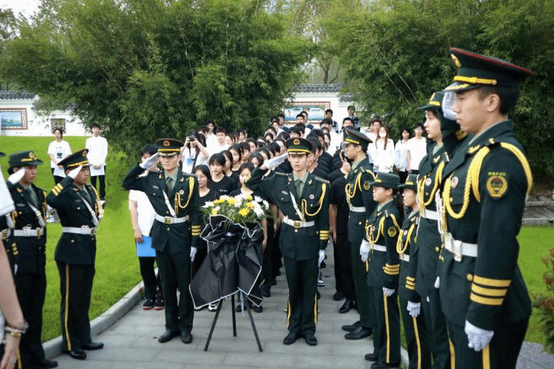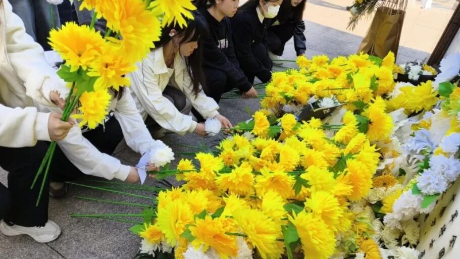 师生们敬献鲜花,鞠躬致敬