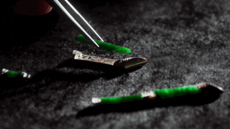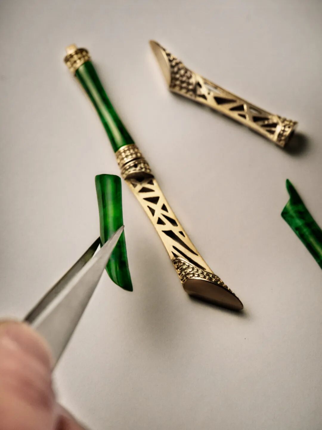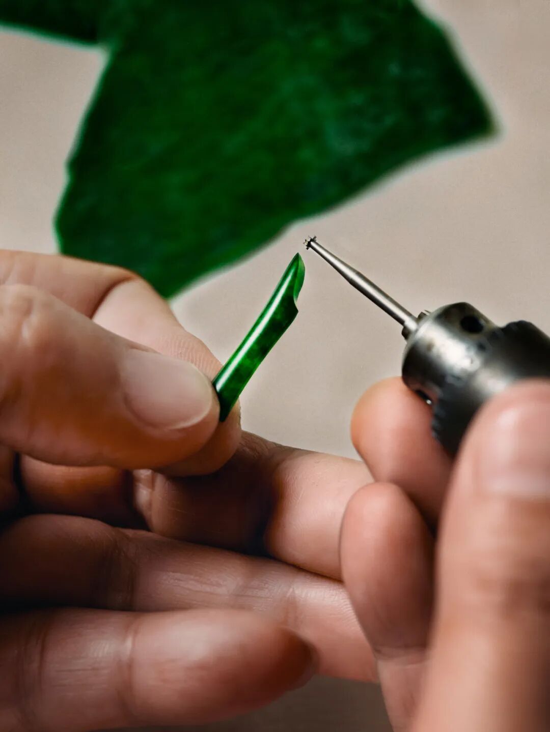 天然翡翠经由精细手工雕刻化身为一节节纤细却有力的茎秆,而竹节则是由白金镶嵌钻石而成,借由铰接工艺相连,使珠宝柔软贴肤、更显优雅。