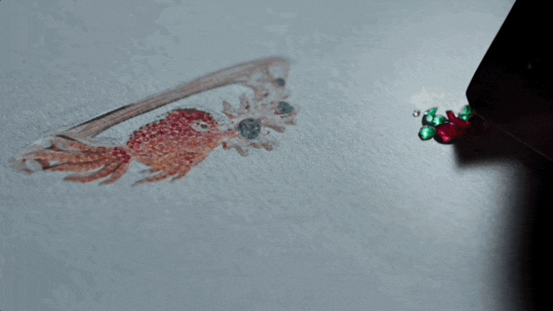 Qeelin用圆形钻石模仿金鱼游动时泛起的气泡,更添俏皮韵味。而鱼头正对着的,是由玫瑰金镶嵌钻石打造的珊瑚丛,祖母绿点缀其上,氤氲蓬勃生机。