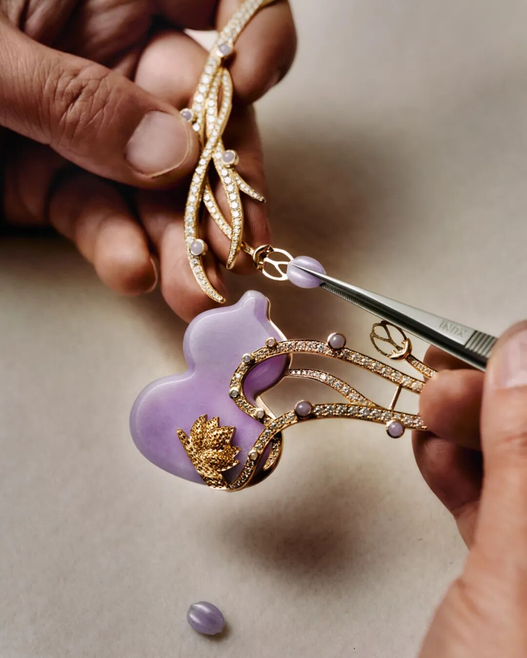以玉上镶钻工艺,让莲花盛开在翡翠葫芦之上。白金钻石勾勒成的花枝上还点缀着翡翠露珠,璀璨钻石映照温润翡翠,一幅月下芙蕖美景跃然眼前。