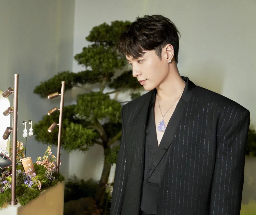 张艺兴佩戴来自 Qeelin 的 Wulu Lotus Pond 高级珠宝系列,莲花寓意出淤泥而不染,拥有高尚纯洁的哲学内涵。