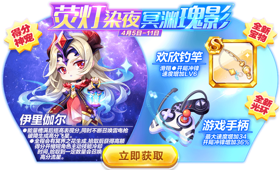 4、活动期间,4月5日登陆酷跑国,可领取深海潜鲨,荧翼飞车,光影战车,刺星火箭体验一天;