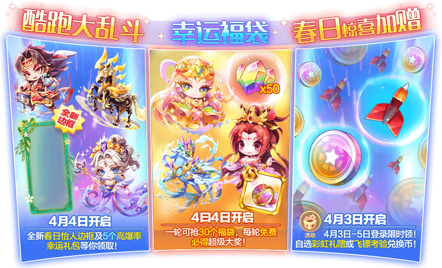 活动期间,4月3日登陆酷跑国,可领取彩虹币*1或飞镖*1;