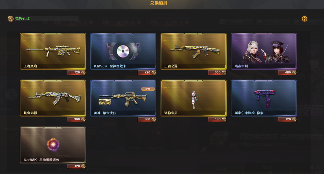 小伙伴们攒够一定数额的兑换币时可前往右上角的兑换道具专区兑换自己心仪的道具!王者凰鸣、星神音效卡、王者之翼、迷你宝贝等道具都可以在这里兑换。