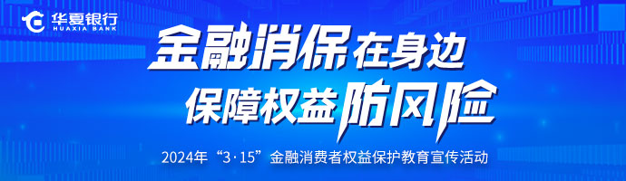 为贯彻落实监管部门消费者权益保护教育宣传工作要求,进一步做好银行业消费者权益保护和金融教育宣传工作,切实提升人民群众金融素养和风险防范意识,增强消费者满意度,构建和谐健康的金融消费环境,在国家金融监督管理总局的统一组织部署下,华夏银行于即日起至3月24日在全行范围内开展 “华夏银行2024年‘3·15’金融消费者权益保护教育宣传活动”。