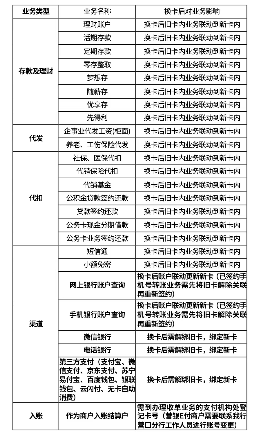 4、银联芯片借记卡到期换卡为非原号换卡,换卡后卡内业务是否需要重新签约绑定,详见附表。