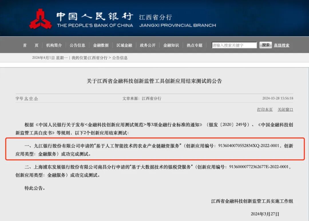 近日,中国人民银行江西省分行发布了“关于江西省金融科技创新监管工具创新应用结束测试的公告”,九江银行申请的“基于人工智能技术的农业产业链融资服务”项目成功完成测试。据悉,九江银行是此次获江西省金融科技创新监管工具第一批创新应用公示的城商行,也是江西省第一个通过测试认定的城商行。