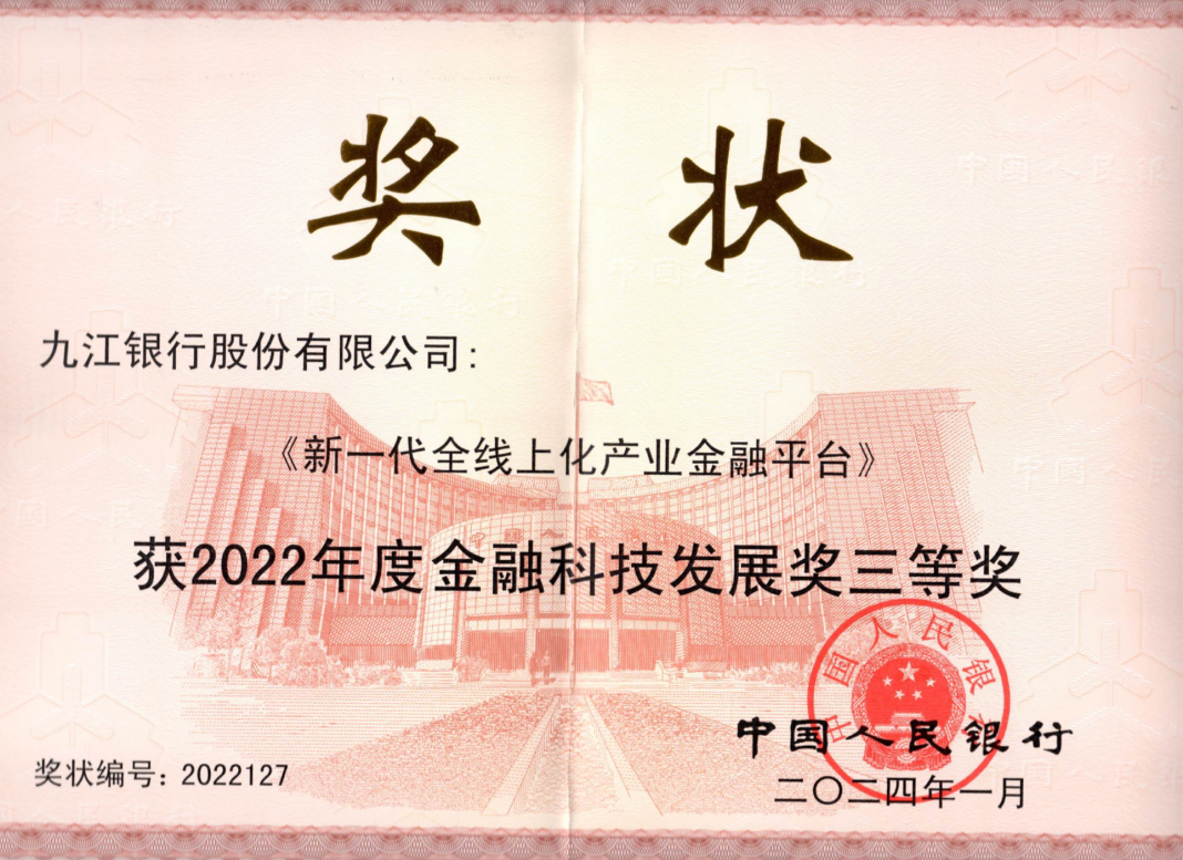 近日,中国人民银行公布了“2022年度金融科技发展奖”(以下简称“金发奖”)获奖名单,九江银行申报的《新一代全线上化产业金融平台》项目获“2022年度金融科技发展奖三等奖”,是中部五省唯一获此殊荣的城商行。