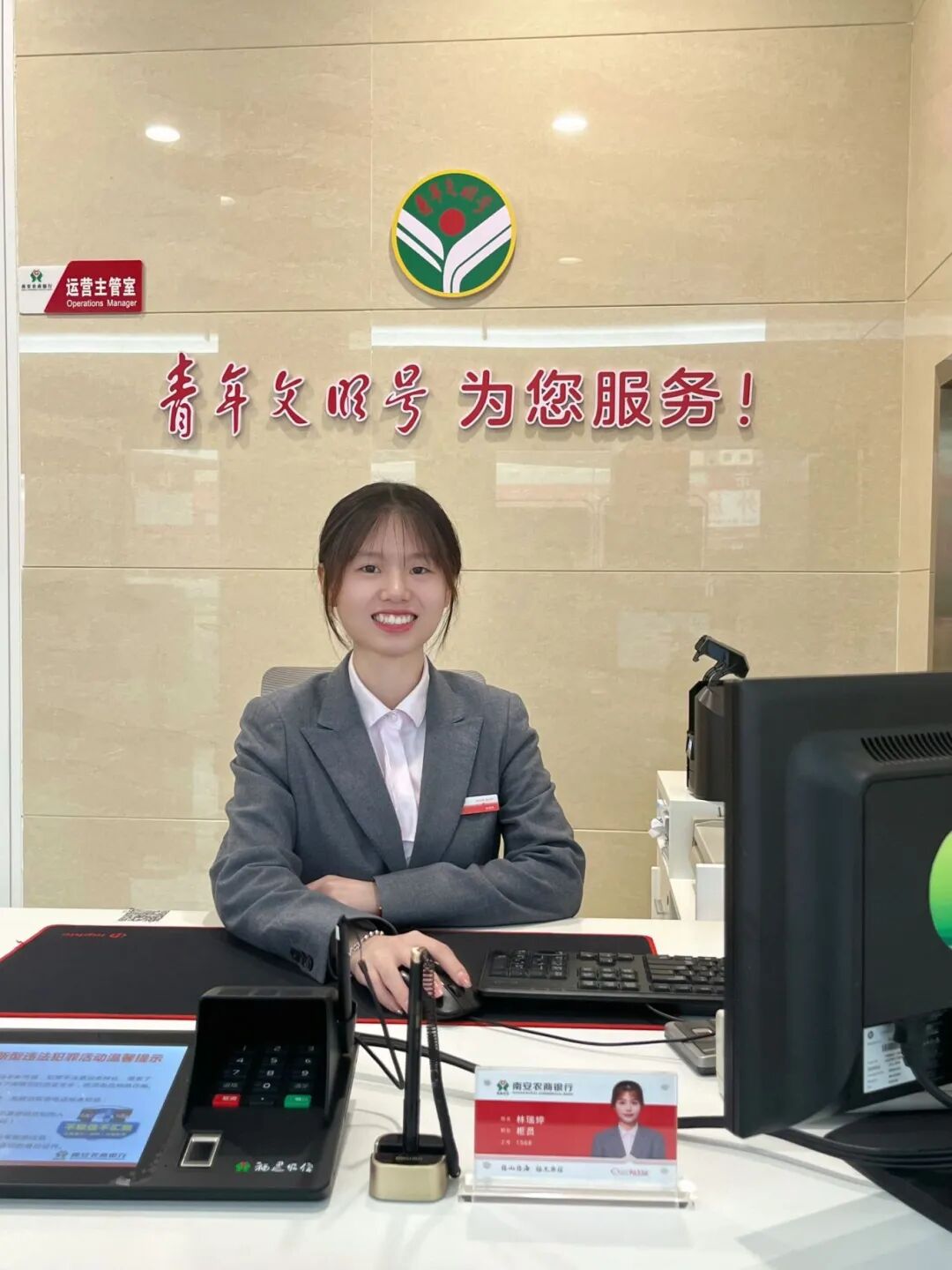 她坚守岗位、高效服务、笑迎客户,她把“微笑在脸、服务在心,优质服务、以心践行”铭记在心,付诸于行,是每一个“她”让金融服务更有温度。