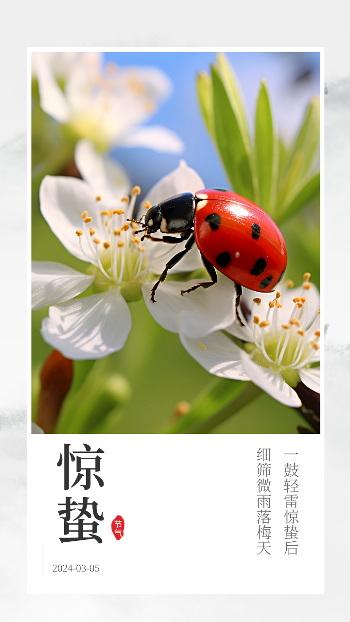 惊蛰,《月令七十二候集解》有:“二月节,万物出乎震,震为雷,蛰虫惊而出走,故曰惊蛰。”