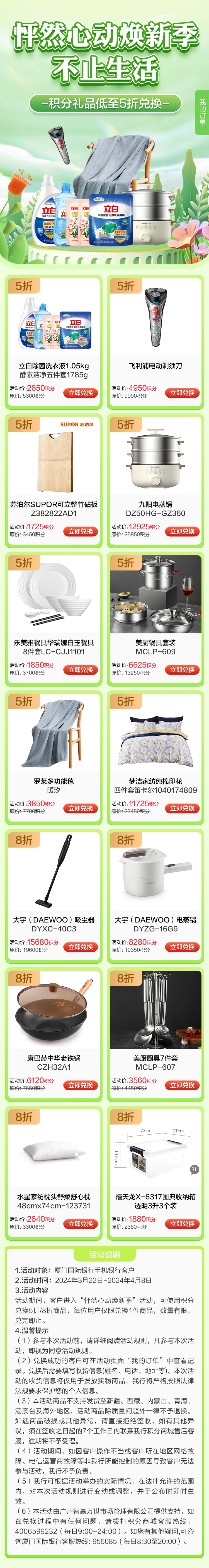 活动期间,客户进入“焕新季”活动,可使用积分兑换5折/8折商品,每位用户仅限兑换1件商品,数量有限,兑完即止。
