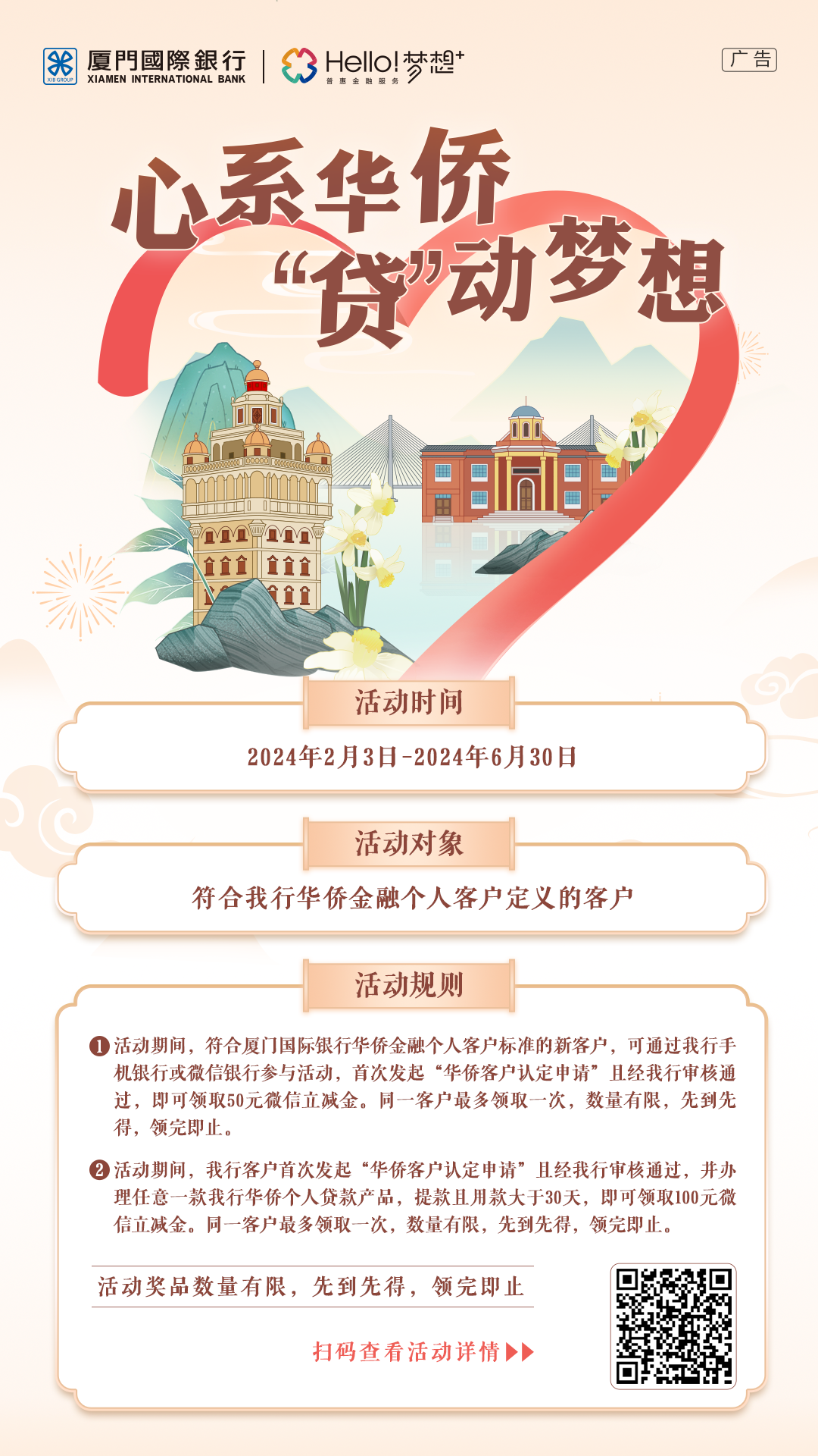 活动期间,符合厦门国际银行华侨金融个人客户标准的新客户,首次发起“华侨客户认定申请”且经我行审核通过,即可在活动页面领取50元微信立减金。同一客户最多领取一次,数量有限,先到先得,领完即止。