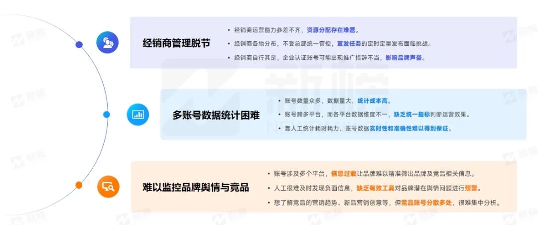 汽车行业中常见的矩阵管理痛点分别有:经销商管理脱节、多账号数据统计困难、难以监控品牌舆情与竞品。