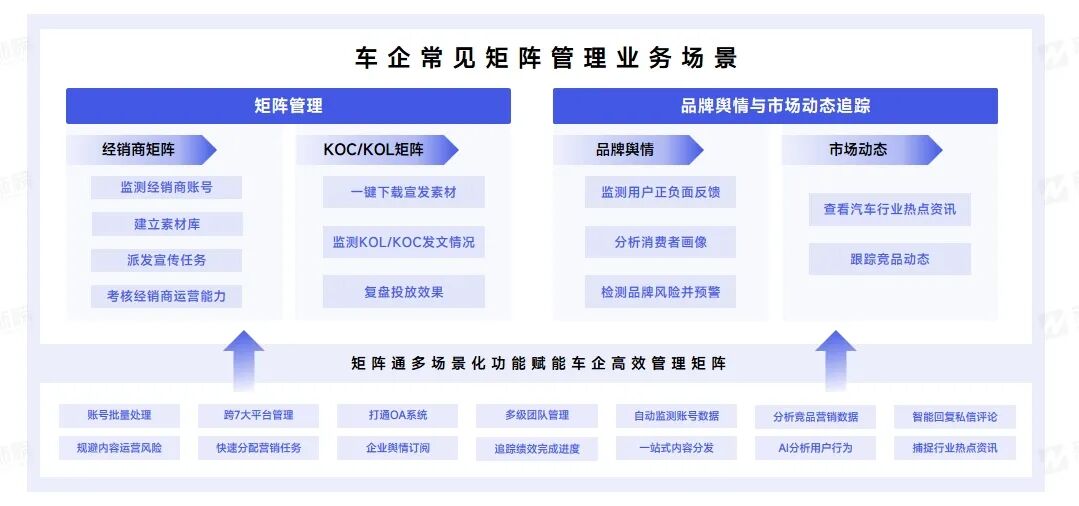 以矩阵通为多账号管理中台,实现车企矩阵账号统一管理,通过提供的多场景化功能与业务深入结合,满足车企矩阵管理、品牌舆情与市场动态追踪等多场景,助力车企通过经销商、KOC/KOL等矩阵实现流量转换,促进营销获客。
