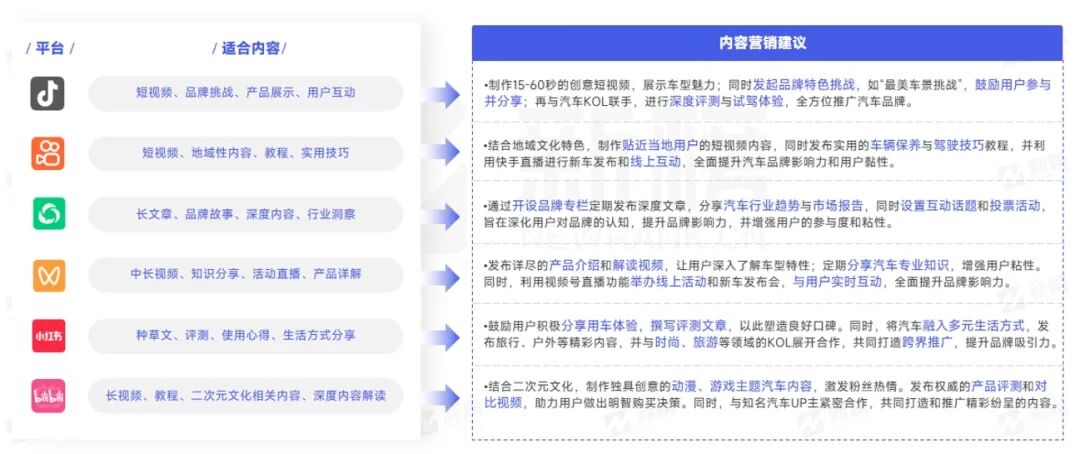 通过深入了解抖音、快手、公众号、视频号、小红书和B站等各大平台的特性、用户群体及互动方式,车企可以更加明智地选择适合自己的平台组合,从而实现营销效果的最大化和预算的高效利用。