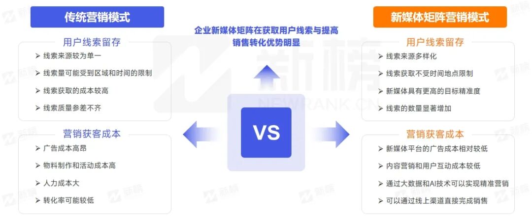 新媒体矩阵的营销方式相较于传统的营销模式在线索留存以及营销获客上拥有明显的优势,通过企业新媒体矩阵,车企可以获得更加多样化的线索来源,以及更精确的线索留存;同时,广告、用户互动等成本的降低,也使得获客变得更加容易。
