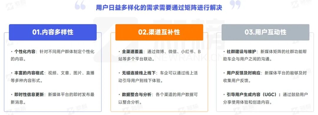 企业新媒体矩阵以其内容的多样化、渠道的互补性和用户的互动性,有效地满足了车企用户多样化的需求,同时为车企提供了深化用户关系和提升品牌认知度的有利工具。