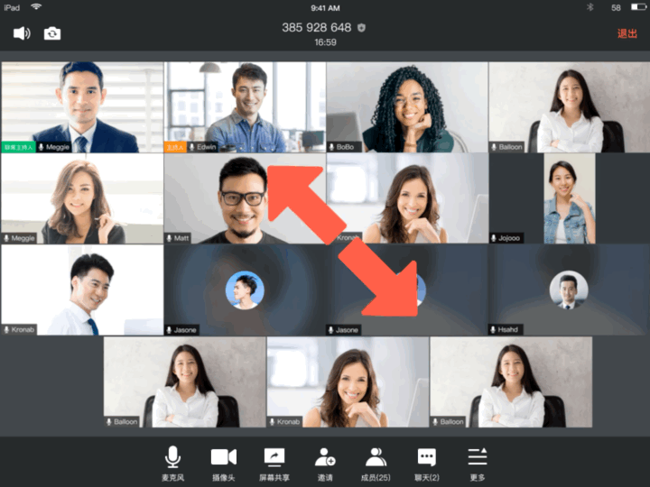 参会人员过多,视频画面太小,导致看不清参会人员的视频画面?希望快速调整宫格分布?用户通过iPad参加视频会议时,支持通过手势快速调节宫格的放大和缩小,以调节宫格视图大小,快速切换宫格布局数量。动一动手指,就让参会人的视频画面,以最合适的大小展示在你面前。指尖轻松滑动,视图随心切换。