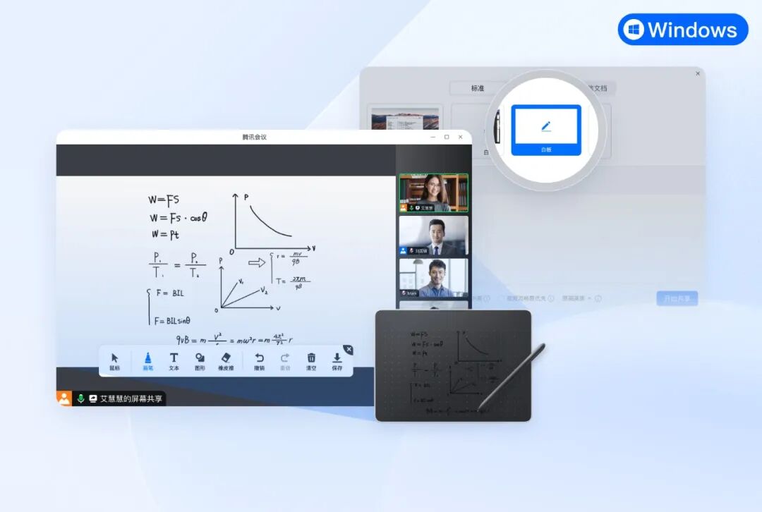 腾讯会议的会中白板提供了画笔、激光笔、图形等多种工具辅助演示,但用鼠标来进行白板书写,费时费力还不清晰。现在,白板支持外接手写板啦!无论是日常办公,还是线上教学,外接手写板后,都可以像在纸上一样随心书写。白板更流畅、便捷,让思路更清晰,让沟通更高效。教育工作者在教学过程中,板书书写必不可少,会议时间宝贵,别让鼠标演示拖了后腿!![]()