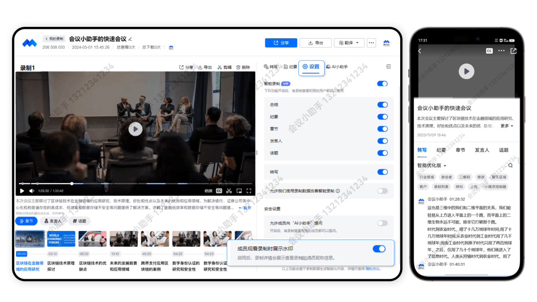 若您想要追问更多细节,还可以就该问题持续多轮问答,答案更清晰准确,帮助您更快速了解会议详情。现在,桌面端、移动端的录制详情页均支持了AI小助手,快来体验吧!云录制水印