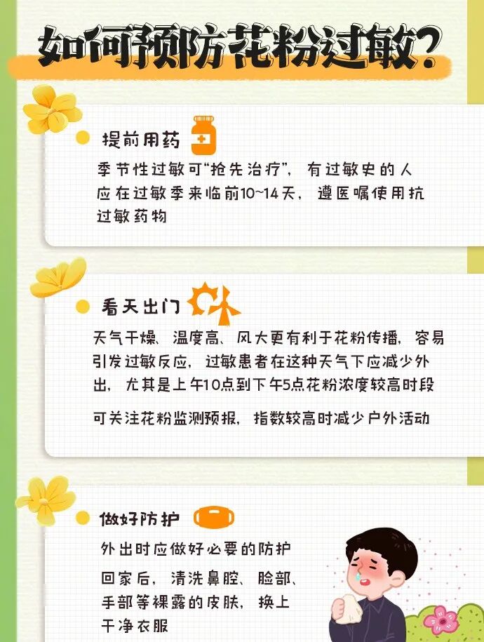 1.减少外出,避免到花粉较多的地方。