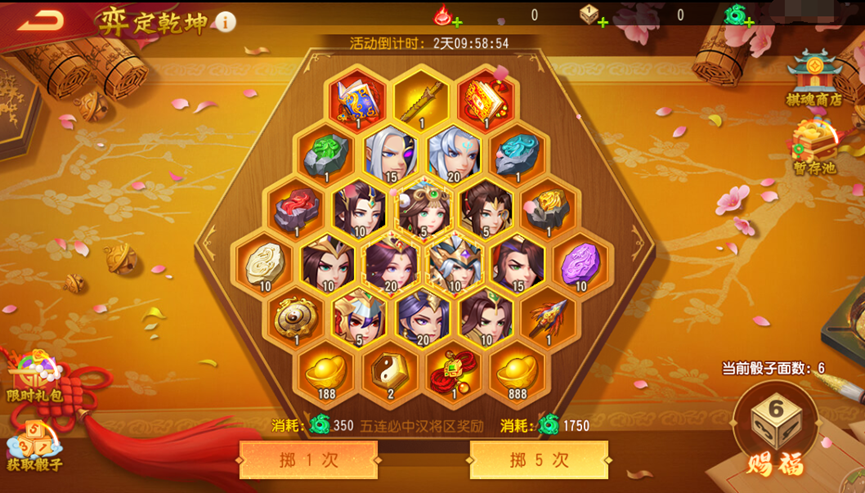 1、主公可以通过完成每日任务、限时礼包购买、玉璧购买的方式来获得抽奖道具【骰子】。