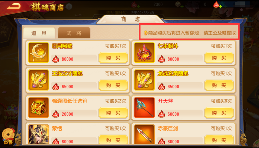 3、主公可以通过出售暂存池内自己不想要的道具或者武将碎片来获取棋魂,使用棋魂在棋魂商店购买想要的道具或武将碎片。