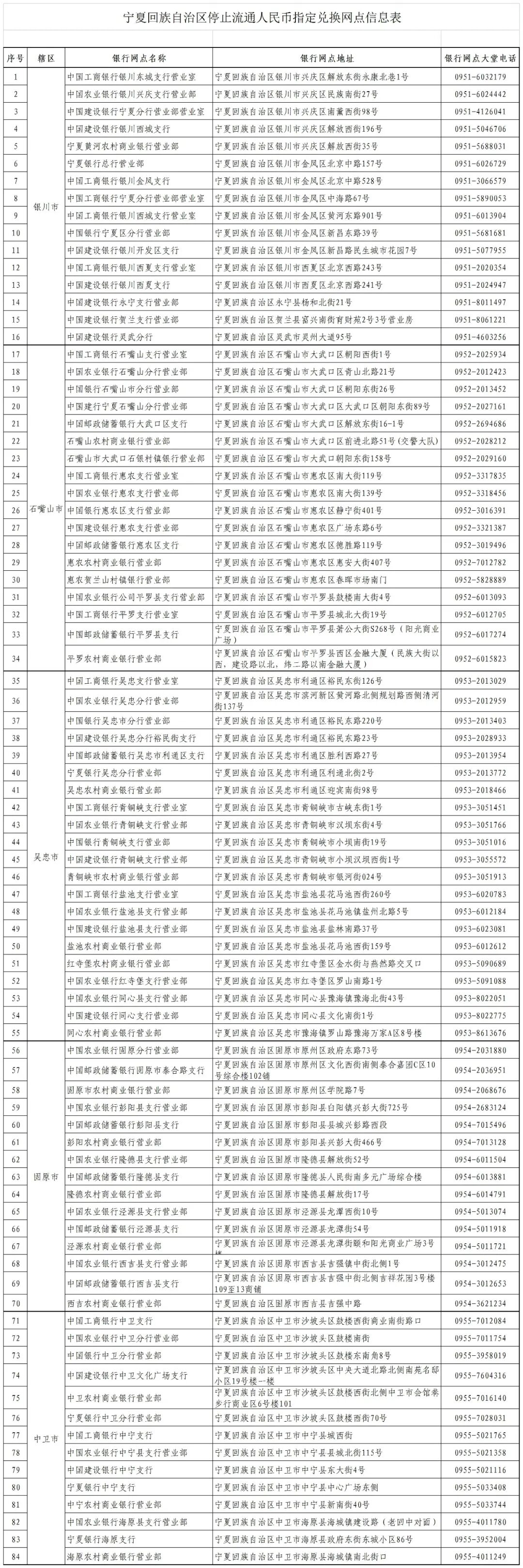重要公告|中国人民银行宁夏回族自治区分行关于宁夏办理停止流通人民币兑换网点信息的公告