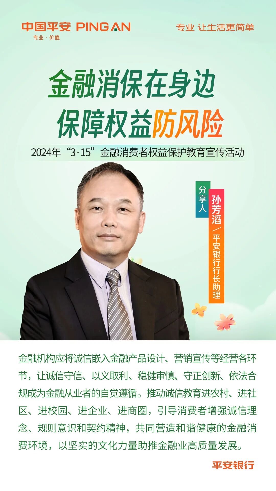 诚,是内在的品质;信,则在外在的表现,怀着诚实不欺的心并付诸实际行动,平安银行将消保审查作为金融消费者权益保护的第一道风险防线,坚决维护金融消费者八大权利,通过系统管控、科技应用、资质认证等手段不断提升消保审查的管理力度和水平,增强金融从业人员的诚信意识,推进企业诚信文化建设,助推业务经营高质量发展,践行社会责任,打造竞争“软实力”,促进金融市场稳定运行,不断提升金融服务的覆盖率、可得性,增强金融消费者的获得感、满意度和安全感。![]()