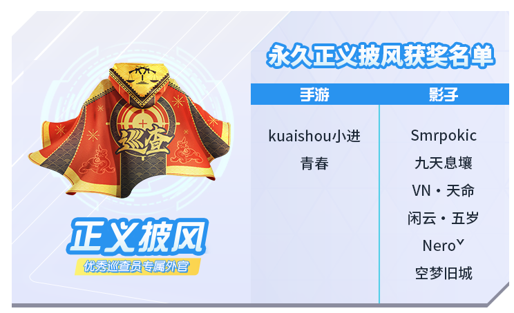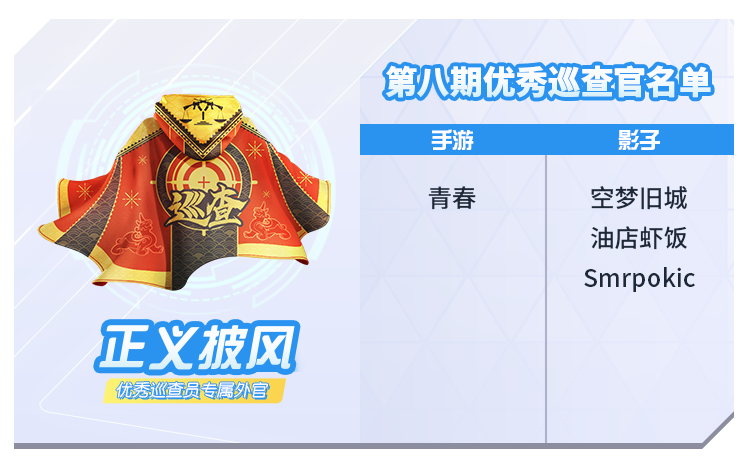 3.每赛季评选一次,进行数据公示。每次选出的优秀巡查官将可获得“正义披风”一个赛季。