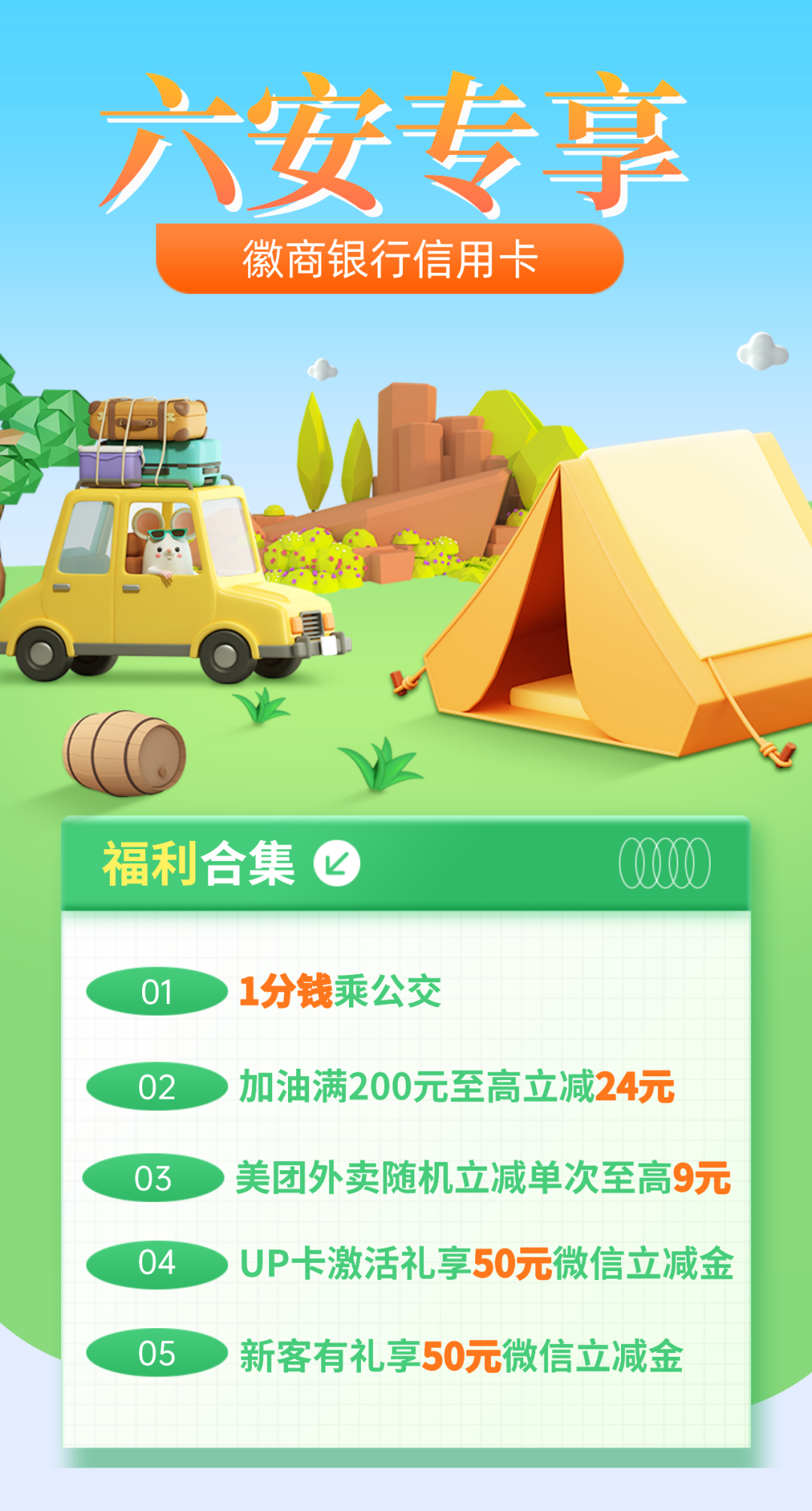 活动期间,客户关注徽商银行信用卡微信公众号--GO·福利-月刷越有礼-六安霍山支行UP卡首刷礼。