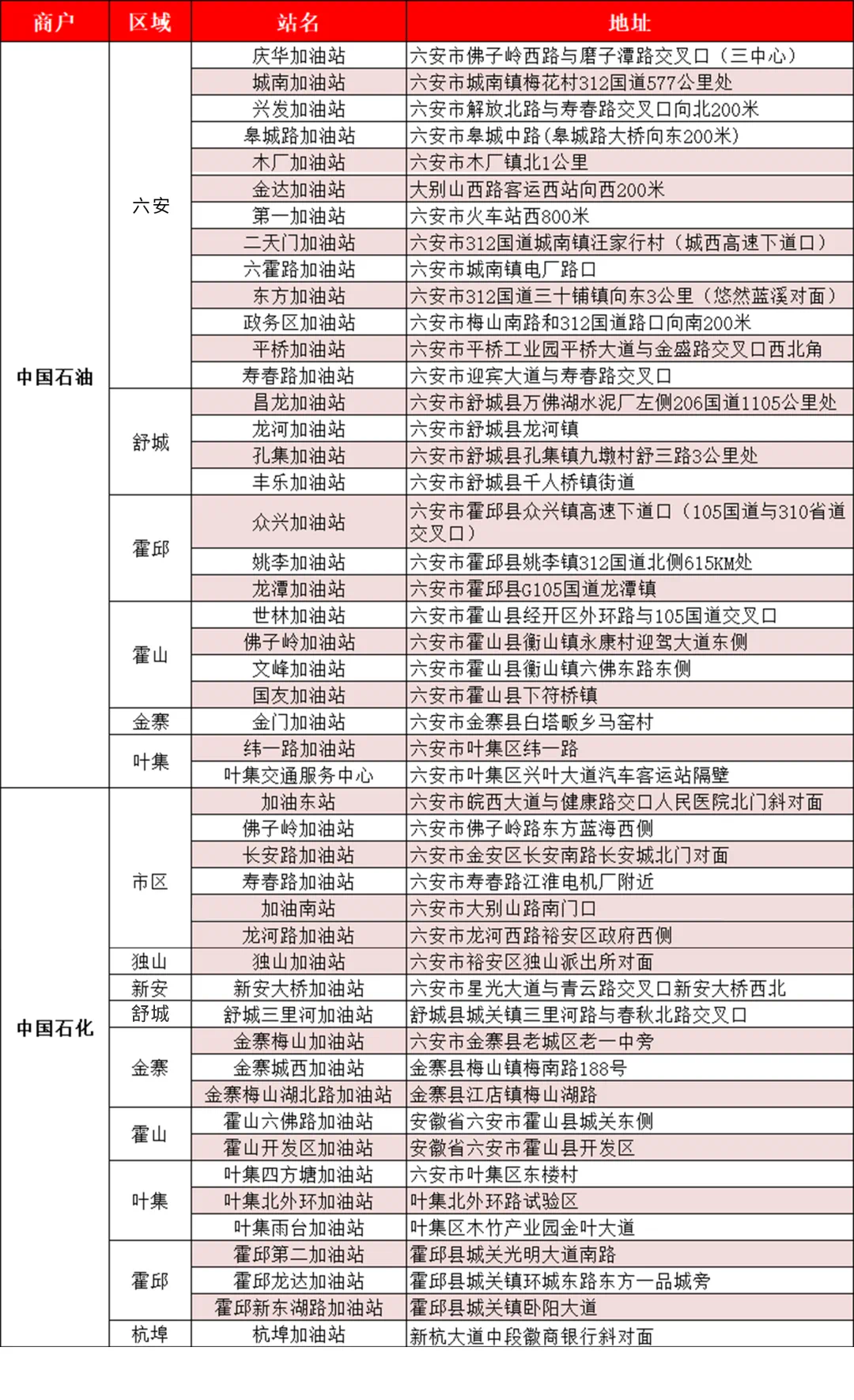 六安地区指定中石油、中石化合作商户: